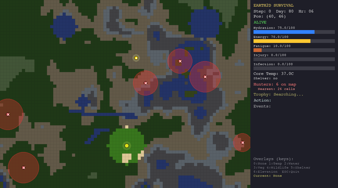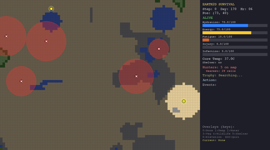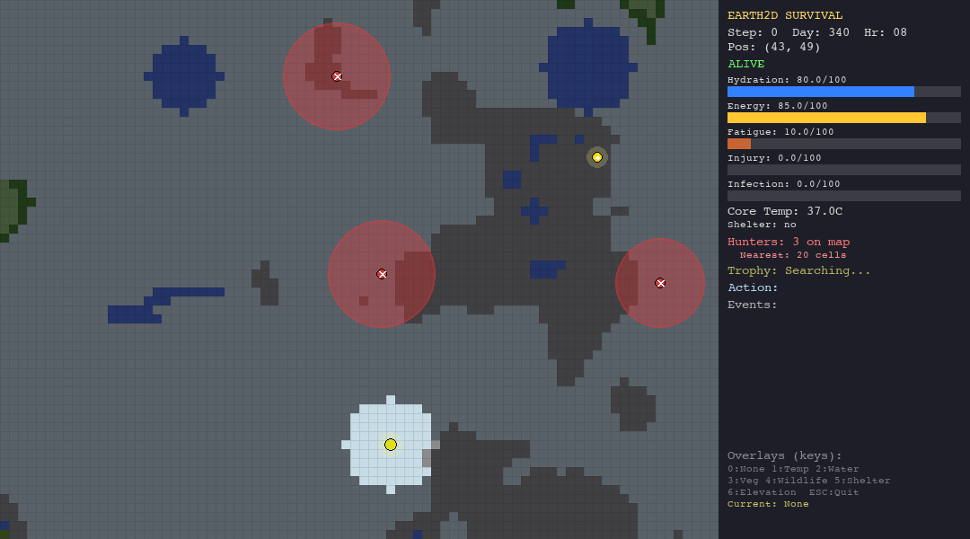 Every decision has a physiological cost. Moving drains energy and hydration. Resting recovers fatigue but burns calories. Staying in the desert without water is a death sentence. Wandering into a hunter’s detection radius triggers a chase you probably will not survive.