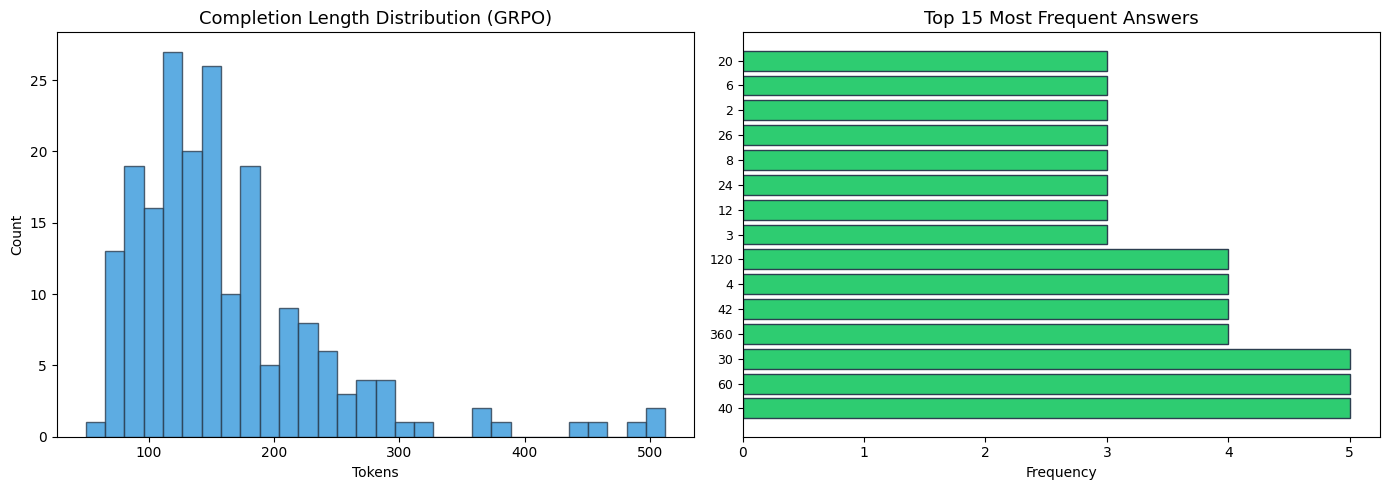 On problems that both models solve correctly, the outputs are structurally similar. The GRPO-trained model tends to produce slightly longer completions (~101 tokens vs ~84 tokens) with marginally more explicit intermediate steps.